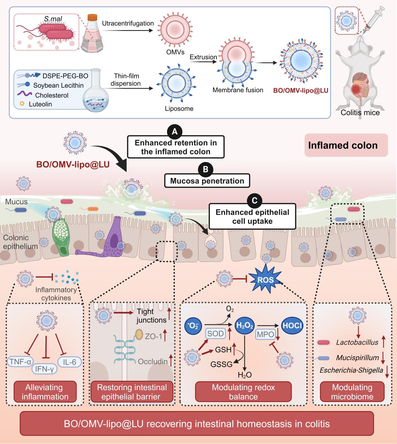 胡凯莉团队通过构建冰片修饰细菌外膜囊泡融合脂质体(BO/OMV-lipo@LU),实现了木犀草素向炎症结肠部位的口服靶向递送,有效修复肠道稳态,提高了木犀草素对结肠炎的治疗效果。研究成果Chemotaxis-driven hybrid liposomes recover intestinal homeostasis for targeted colitis therapy发表在药剂学领域权威国际期刊Journal of Controlled Release。