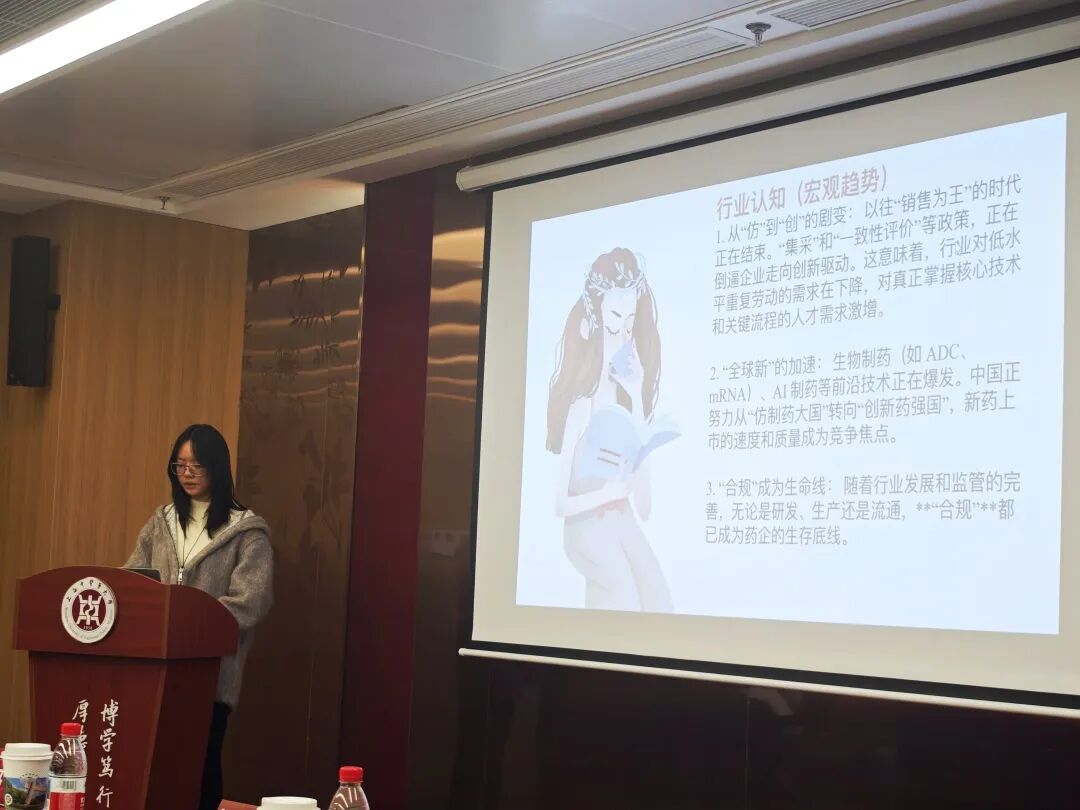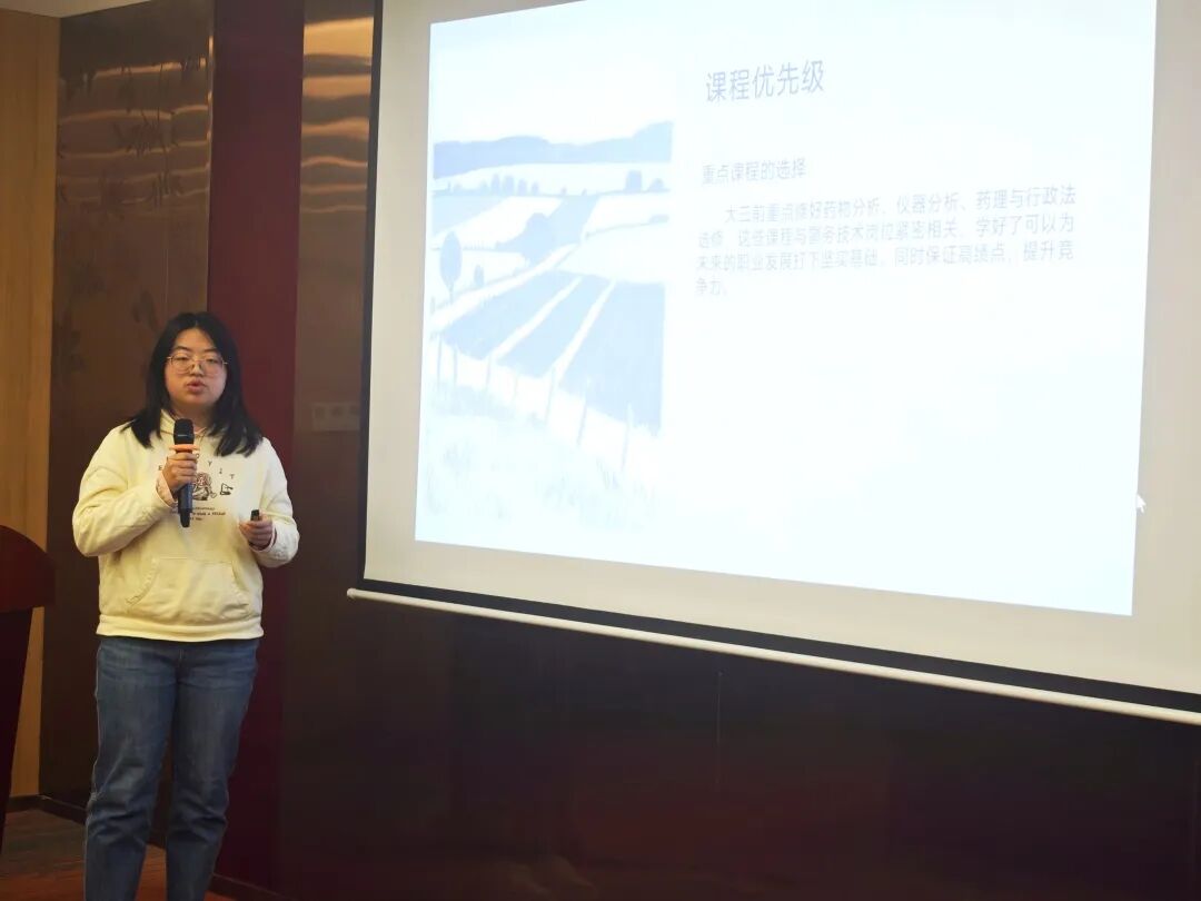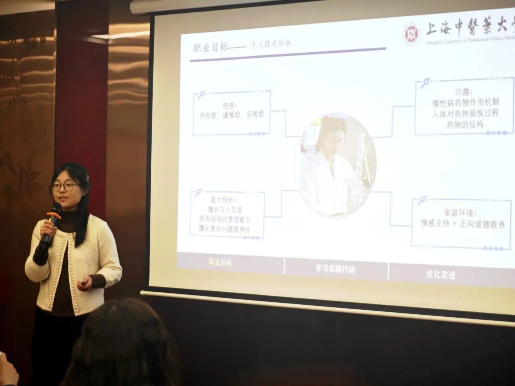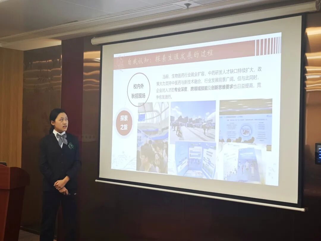 大赛在紧张而热烈的氛围中正式拉开帷幕。来自学院各年级的八位优秀选手张玉洁、陈愉、陈思语、庄靖铭、陈智杨、孙笑悦、孔语佳、陈妍蓉依次登台,展开了精彩纷呈的职业生涯规划展示。八位选手立足专业特色,结合个人兴趣、能力特点与时代需求,展开了对未来的深度思考与精心规划。他们的职业目标多元而清晰,涵盖了中药研发、质量控制、药品注册与监管等多个方向。