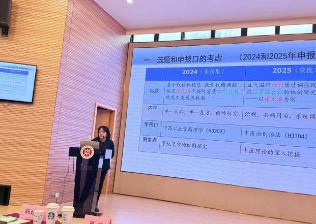 面上项目获得者吴华丽、高建平、席志超、郭腾、冯靖娴五位老师分别从不同角度分享了心得。吴华丽老师侧重申报口选择、时间规划与研究内容呈现;高建平老师以“益气温阳抗心肾综合征”项目为例,详细阐述了中医口项目在科学假说构建与技术路线优化上的实践;席志超老师将申报过程比喻为“春耕”,从“择种”(选定科学问题)、“备耕”(夯实研究基础)、“顺时”(紧扣前沿热点)到“破土”(凝练特色创新),形象传递了申报的完整逻辑;郭腾老师强调“坚守与改变”,主张以中医药理论为基石,结合临床与现代研究,注重细节,化繁为简;冯靖娴老师则提出“国自然撰写中的‘黄金7秒法则’”,强调重点突出、逻辑严密、整体无懈可击的标书才能赢得评审青睐。