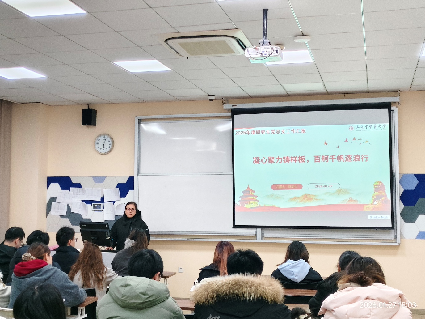 会议伊始,陈秀兰同志作题为《凝心聚力铸样板,百舸千帆逐浪行》的年度工作汇报,系统总结了研究生党总支2025年度整体工作成效。汇报从党总支组织建设、党员发展情况、样板党支部品牌建设、党建引领志愿服务以及各研究生党支部建设进展等方面展开,全面回顾了过去一年党总支在强化政治引领、夯实组织基础、服务科研育人中的实践探索与成果。
