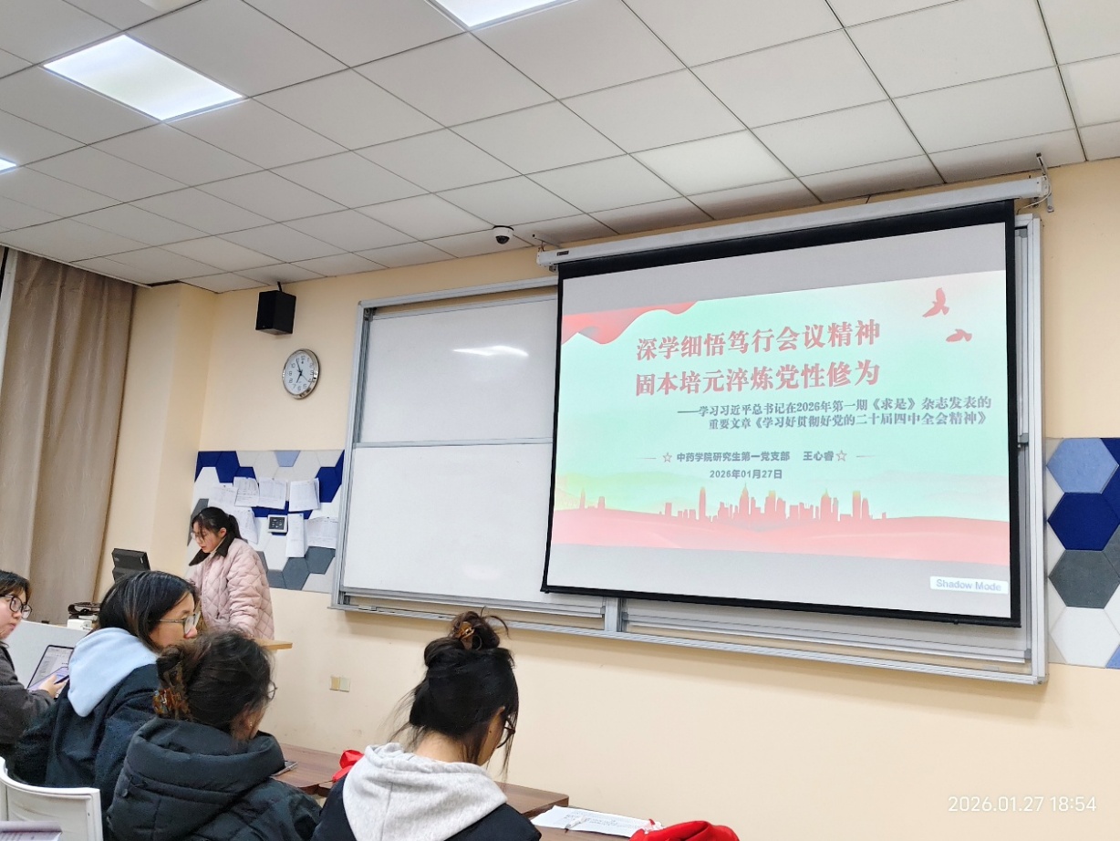 随后,各研究生党支部书记依次进行述职汇报。研究生第一党支部书记马美琳以《衔接研序强党建,服务攻坚促成长》为主题,汇报了支部在党建融入科研培养全过程中的实践经验;研究生第二党支部书记普青以《传承杏林担使命,奋楫笃行谱新篇》为题,重点介绍了支部在理论学习与中医药文化传承中的特色做法;研究生第三党支部书记李乔睿围绕《党建引领科研路,岐黄薪火建新功》,总结了支部以党建促科研、以科研强担当的探索路径。